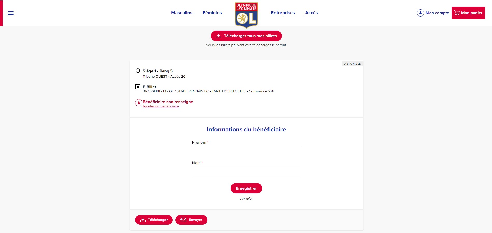 Etape 3 – Dans l'onglet "Mon compte" puis "Mes billets", renseignez les informations du porteur de chaque billet puis cliquez sur « Imprimer » pour télécharger la place au format PDF ou sur « Envoyer » pour envoyer la place par email.
