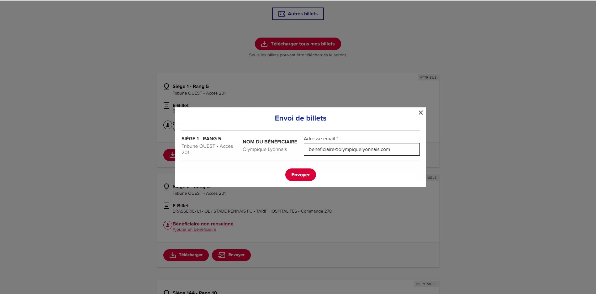 Etape 4 – Si vous avez choisi « Envoyer », indiquez l’adresse email du destinataire de la place.