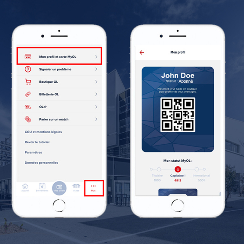 Pour prouver votre statut et profitez de vos avantages (abonné / CSE / MYOL) en boutique (OL et OL Vallée) il faudra présenter votre QR code : 1 : Ouvrez l’application Groupama Stadium / 2 : Rendez-vous dans la rubrique “Mon profil et carte MYOL”