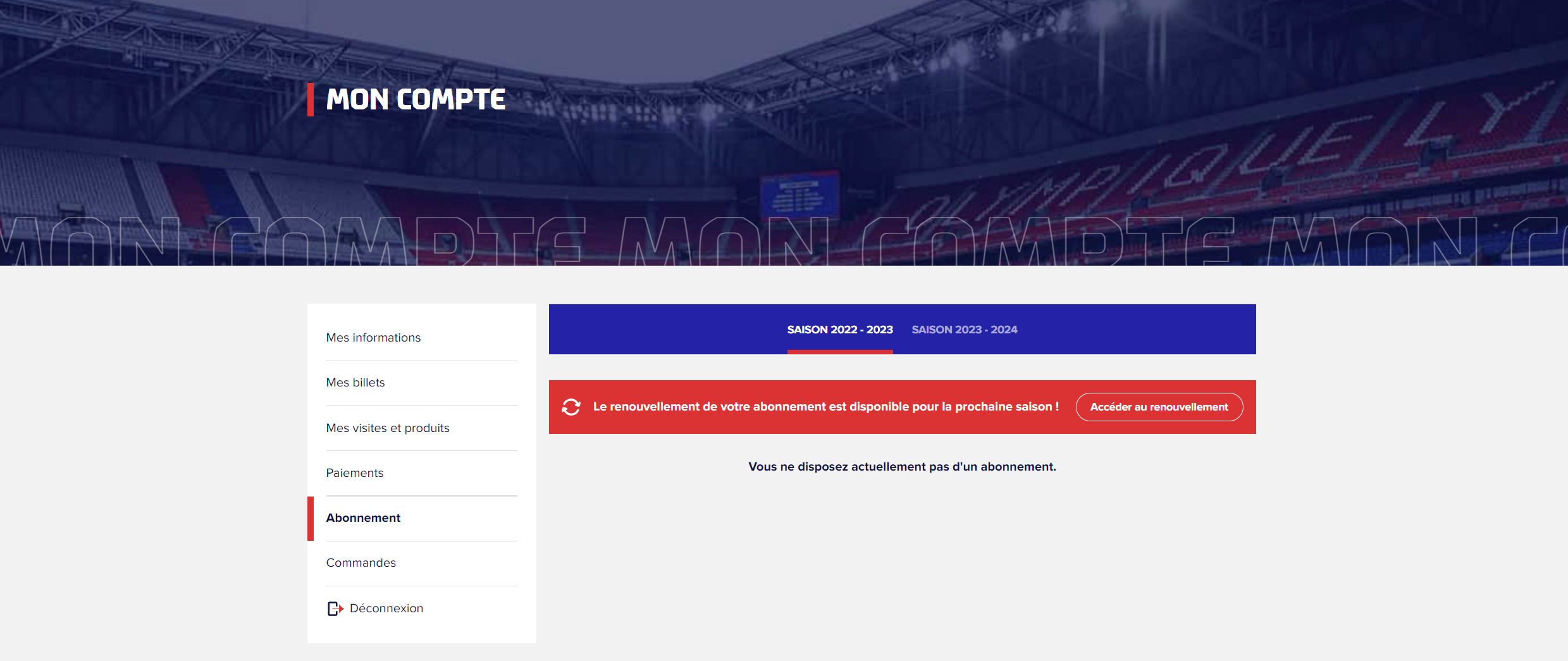 Si vous souhaitez une carte d'abonnement pour la saison 2023-2024, merci de contacter le service client à serviceclient@ol.fr.