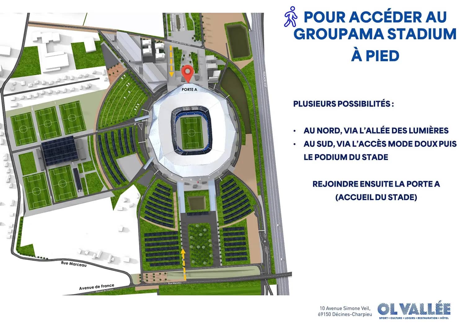 Vous pouvez accéder au Groupama Stadium à pied en empruntant les rampes d’accès au stade. Un accès réservé aux personnes en situation de handicap / mobilité réduite est situé sur la droite de la rampe nord-ouest.